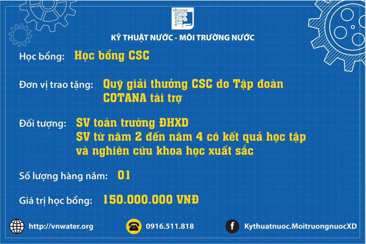 Sinh viên theo học chuyên ngành này không chỉ nhận được giảng dạy tận tâm của thầy cô giáo, hỗ trợ của các anh chị sinh viên khóa trước, mà còn là các suất học bổng khuyến khích học tập từ Đại học Xây dựng Hà Nội, trong đó có cả những học bổng giá trị lớn như CSC, Đỗ Quốc Sam, …Ngoài ra, sinh viên chuyên ngành Kỹ thuật Nước - Môi trường nước (dựa theo thành tích học tập, NCKH, hoạt động phong trào, sinh viên có hoàn cảnh khó khăn...) còn được nhận nhiều suất Học bổng ngành Nước, Học bổng của Khoa KTMT.