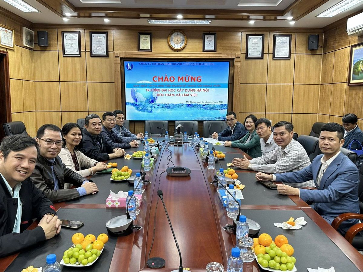 Bên cạnh đó, đoàn còn có buổi làm việc và trao đổi chuyên môn cùng Công ty CP Kinh doanh Nước sạch Hải Dương, nơi các kỹ sư và chuyên gia trong ngành đã chia sẻ nhiều kinh nghiệm quý báu về quản lý, vận hành, cũng như những thách thức thực tế trong việc đảm bảo nguồn nước an toàn, bền vững, nâng cao chất lượng dịch vụ theo phương châm phục vụ khách hàng 24/7/365. Các cựu sinh viên ngành Nước ĐHXDHN đã rất nhiệt tình tiếp đón và hướng dẫn các thế hệ đàn em tham quan Nhà máy xử lý nước cấp Cẩm Thượng – ORET, một công trình trọng điểm với nhiều giải pháp công nghệ mới.
