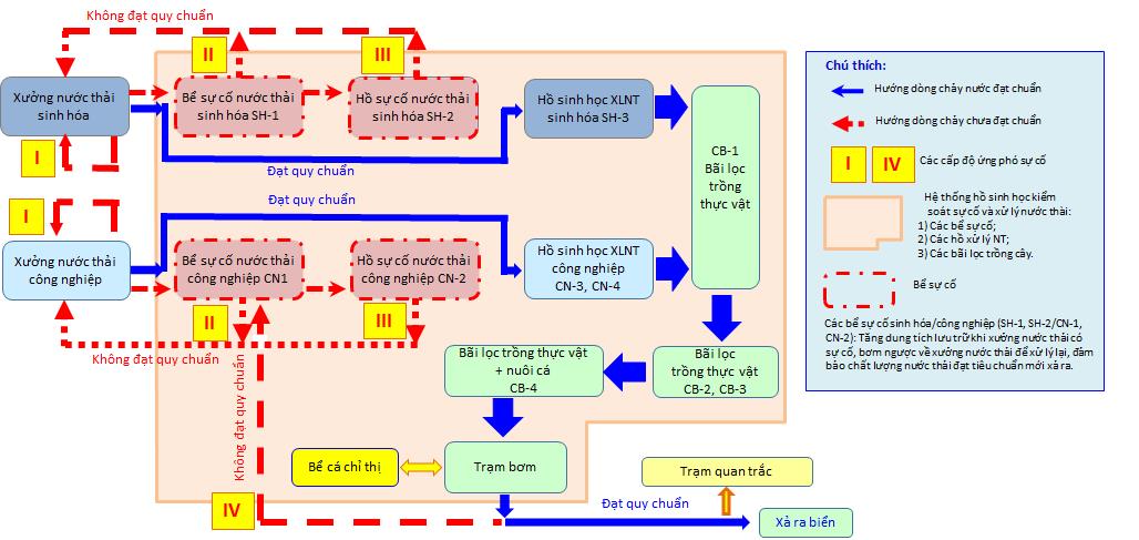 Cấp độ ứng phó sự cố thứ 1: Phần mềm giám sát sẽ có cảnh bảo khi dữ liệu từ hệ thống quan trắc tự động sau Trạm XLNT sinh hóa và Trạm XLNT công nghiệp chỉ bất kỳ một chỉ tiêu đạt 80% giá trị kiểm soát, để người điều hành kiểm tra, xác nhận sự cố và nguyên nhân. Khi dữ liệu chỉ giá trị chất lượng nước đạt 90% giá trị kiểm soát, sẽ ngừng dẫn nước thải vào hệ thống hồ. Van tuần hoàn sau Trạm sinh hóa hoặc Trạm công nghiệp được mở, đưa nước sau xử lý trở lại về bể sự cố trong Trạm XLNT đó để xử lý lại. Khi nước thải đạt yêu cầu mới được đưa đến chuỗi hồ (nước thải sinh hóa chảy vào hồ SH3, nước thải công nghiệp chảy vào hồ CN3). Khi khắc phục được sự cố thì chuỗi hồ trở lại hoạt động bình thường.