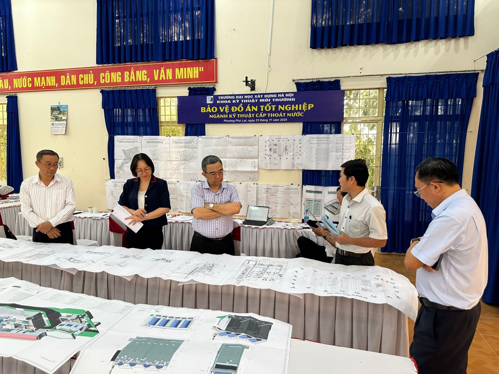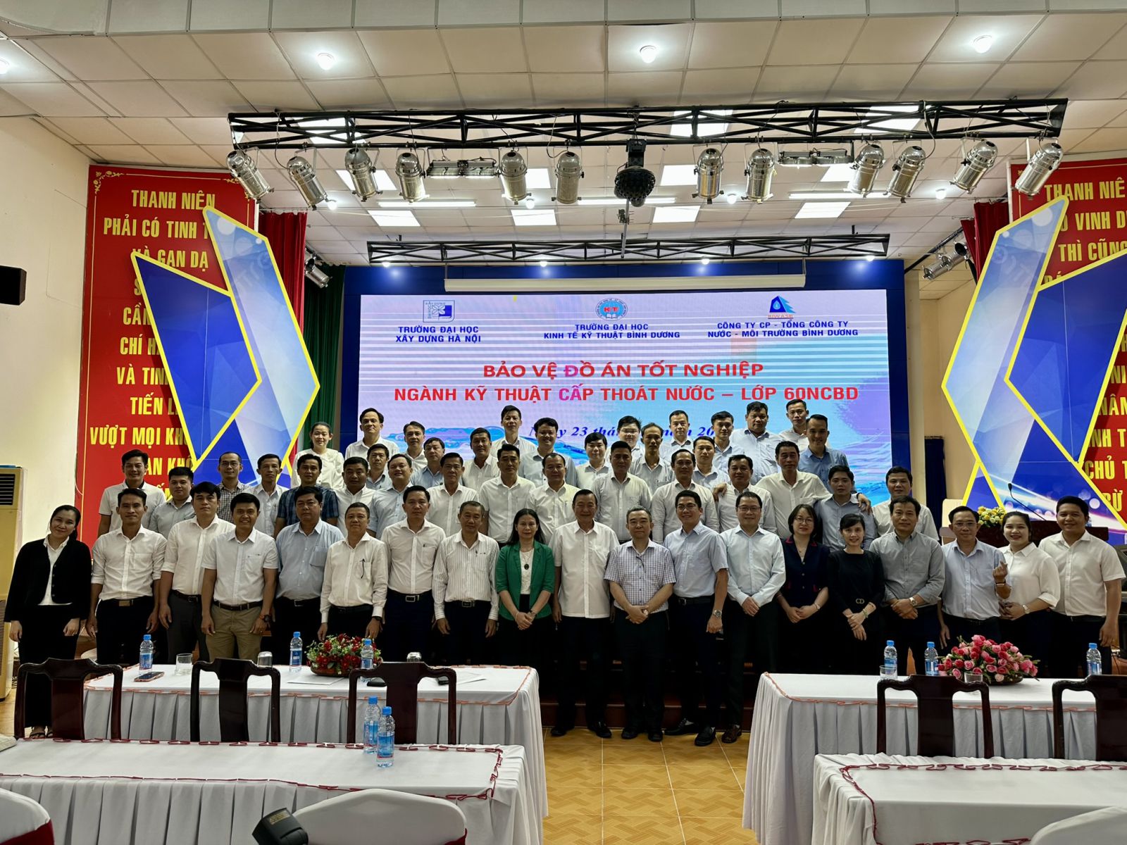Trong 2 ngày 23+24/11/2025, Trường Đại học Xây dựng Hà Nội phối hợp với Trường Đại học Kinh tế - Kỹ thuật Bình Dương và Công ty CP – Tổng công ty Nước – Môi trường Bình Dương (BIWASE) tổ chức thành công Lễ bảo vệ đồ án tốt nghiệp cho 39 sinh viên ngành Kỹ thuật Cấp thoát nước tại Phường Phú Lợi, TP. Hồ Chí Minh (Thành phố Thủ Dầu Một, Tỉnh Bình Dương cũ). Đây là các cán bộ, nhân viên của Tổng công ty BIWASE và Công ty CP Cấp nước Đồng Nai, đang công tác trên địa bàn các tỉnh, thành phố: TP. Hồ Chí Minh (Bình Dương cũ), Đồng Nai (Đồng Nai cũ), Tây Ninh (Long An cũ).