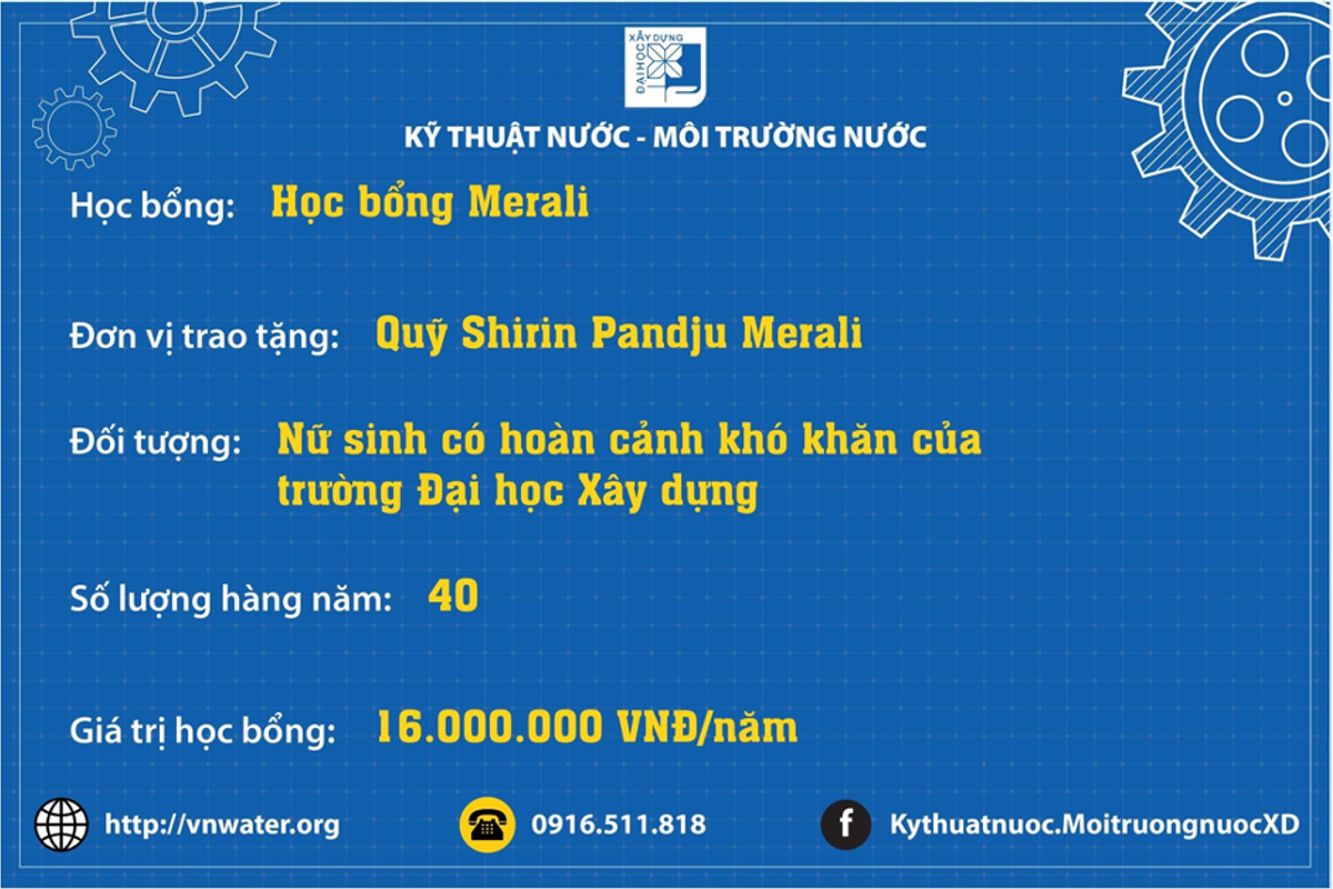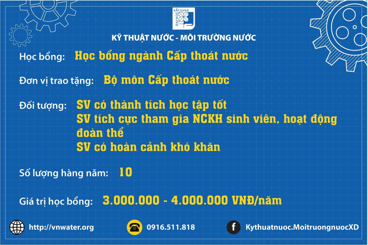 Một số đơn vị luôn đồng hành, tài trợ học bổng cho sinh viên : Hội Cấp thoát nước Việt Nam, Tập đoàn Sơn Hà, CTY Nagaoka, Nhựa Tiền Phong, CTY DNP Water, CTY Nước sạch Hà Nội, CTY Nước sạch Hải Dương, CTY Cấp nước Hải Phòng, Công ty cổ phần VIWASE, CTY CP VICEN, CTY VIETCHEM, CTY VUCICO, và nhiều doanh nghiệp, cựu sinh viên...