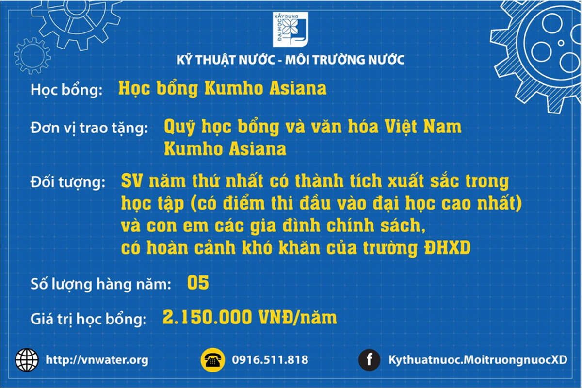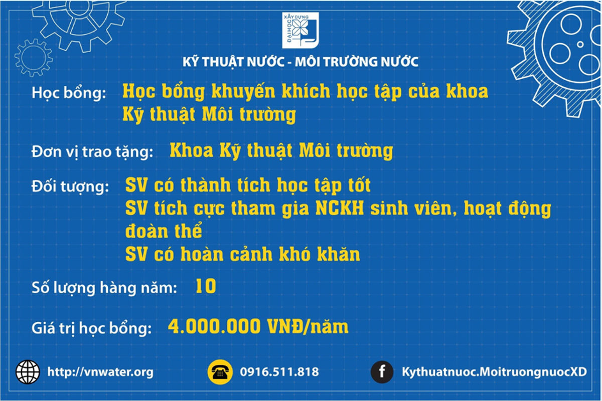 Sinh viên theo học chuyên ngành này không chỉ nhận được giảng dạy tận tâm của thầy cô giáo, hỗ trợ của các anh chị sinh viên khóa trước, mà còn là các suất học bổng khuyến khích học tập từ Đại học Xây dựng Hà Nội, trong đó có cả những học bổng giá trị lớn như CSC, Đỗ Quốc Sam, …Ngoài ra, sinh viên chuyên ngành Kỹ thuật Nước - Môi trường nước (dựa theo thành tích học tập, NCKH, hoạt động phong trào, sinh viên có hoàn cảnh khó khăn...) còn được nhận nhiều suất Học bổng ngành Nước, Học bổng của Khoa KTMT.