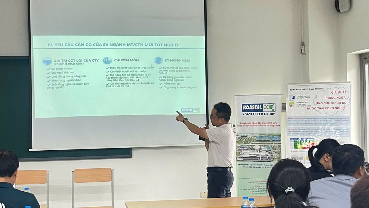 Đồng thời, dưới góc nhìn doanh nghiệp, phía công ty cũng chia sẻ những yêu cầu của nhà tuyển dụng với sinh viên ngành Cấp thoát nước, để các em có thể nhanh chóng thích nghi và đáp ứng yêu cầu công việc sau khi ra trường. Đây thật sự là những chia sẻ rất quý báu với các bạn sinh viên ngành Nước. Các bạn sinh viên năm cuối (K65, 66) cũng rất nhiệt tình đặt các câu hỏi cho nhà tuyển dụng tương lai để hiểu thêm về nghề nghiệp, mức lương và triển vọng phát triển.